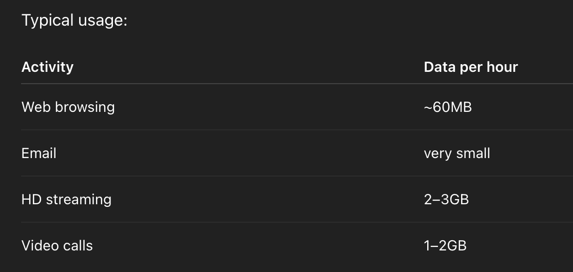 For occasional browsing and streaming, a 100–200GB monthly SIM plan is usually enough. Remote working or frequent streaming may require unlimited data.